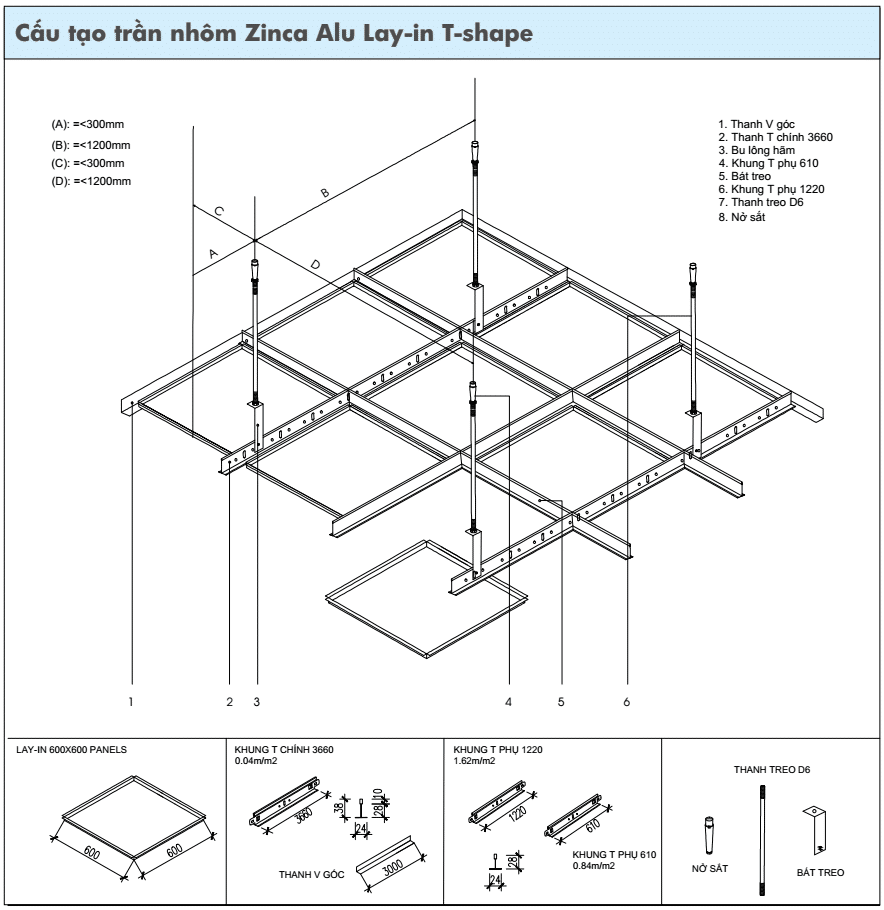 • Hệ khung trần làm bằng thép lá mạ nhôm kẽm, mạ kẽm hoặc mạ màu, dạng thanh có tiết diện mặt cắt chữ T và V hình. Dáng bên ngoài đồng nhất trên bề mặt làm việc, hệ khung có màu xanh dương đặc trưng.