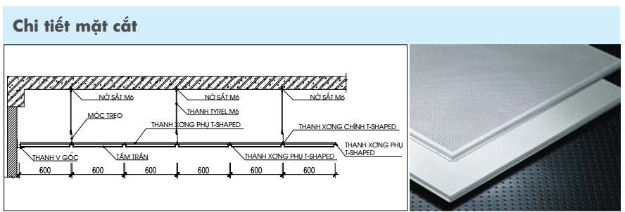 • Tấm trần được thả lên trên hệ khung, việc tháo lắp, bảo trì, sửa chữa và thay thế rất đơn giản, thích hợp với các hệ thống chiếu sáng.